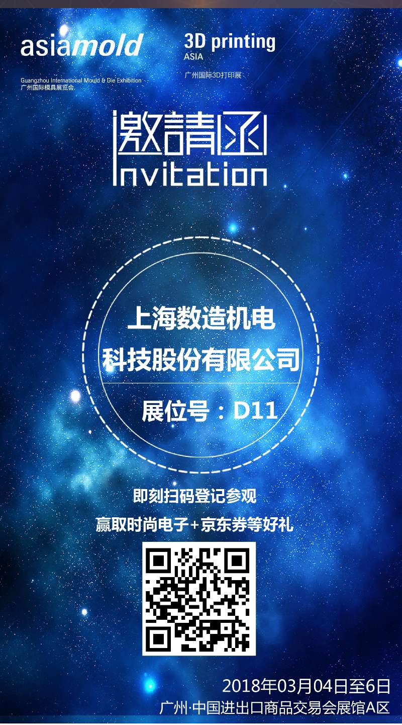 上海數(shù)造將亮相第十二屆“廣州國際模具展覽會(huì)(Asiamold)”,上海數(shù)造的發(fā)展道路離不開您的支持與肯定。2018年3月4日—6日,廣州·中國進(jìn)出口商品交易會(huì)展館A區(qū)D11號(hào)展位,恭候您的到來。