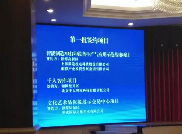 會議的簽約儀式中,上海數(shù)造機(jī)電科技股份有限公司作為第一家簽約公司,將在湘潭市高新區(qū)智造谷,成立3D打印設(shè)備生產(chǎn)及示范應(yīng)用基地(擬成立湖南數(shù)造公司),總投資為3000萬元。將以3D打印設(shè)備生產(chǎn)、3D掃描及打印服務(wù)、3D設(shè)備應(yīng)用示范、3D學(xué)院(3D教育)、行業(yè)云平臺服務(wù)為主要職能。